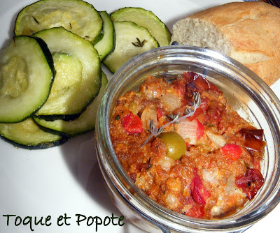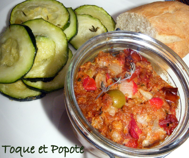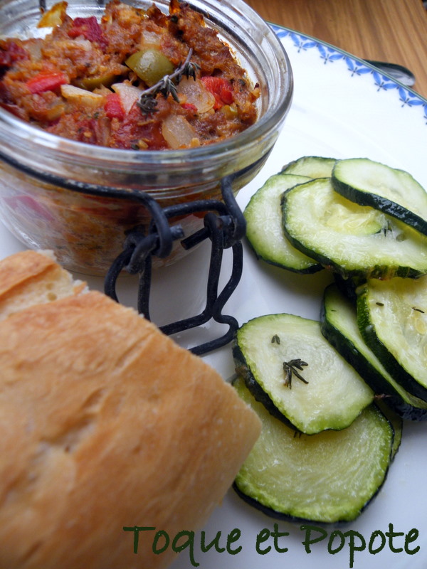 Dégustez chaud, tiède ou froid, accompagné de bon pain et d'une salade ou comme ici, de courgettes confites (marinées dans un peu d'huile d'olive+thym+sel et poivre puis confites au four 1 heure ou plus à 90°C°.