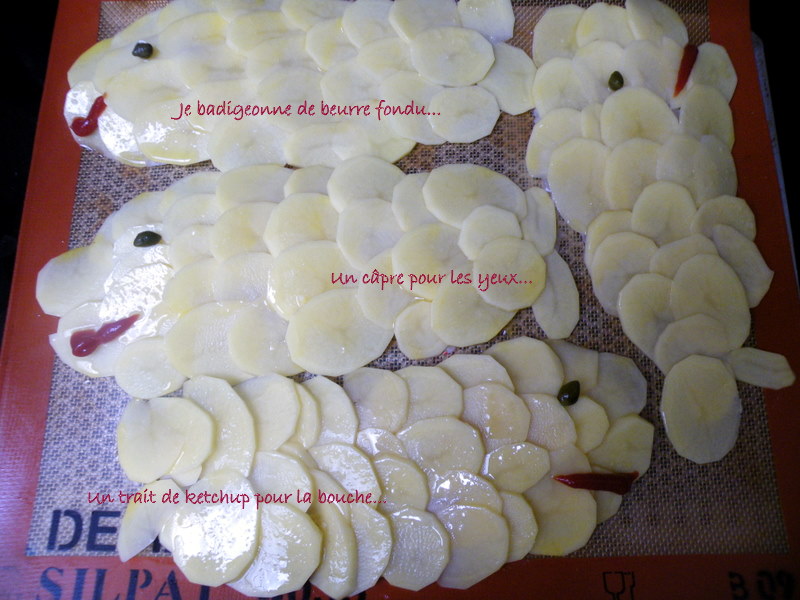 Beurrez ou huilez les rondelles au pinceau. Salez et poivrez. Placez les câpres pour faire les yeux, faites un trait de ketchup pour la bouche....