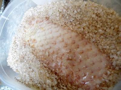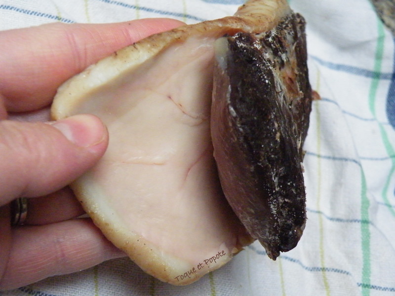 Au bout de la nuit (le matin quoi!), sortez le magret du gros sel (que vous gardez précieusement pour la prochaine vague de verglas devant votre porte...), enlevez un maximum de sel, frottez-le avec un torchon propre si besoin. Il ressemble à ça:
