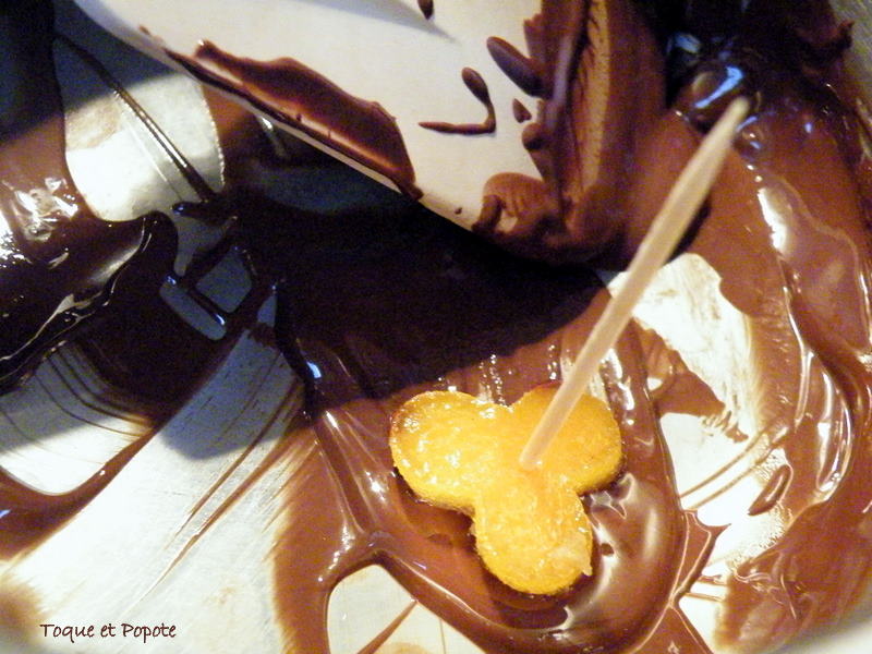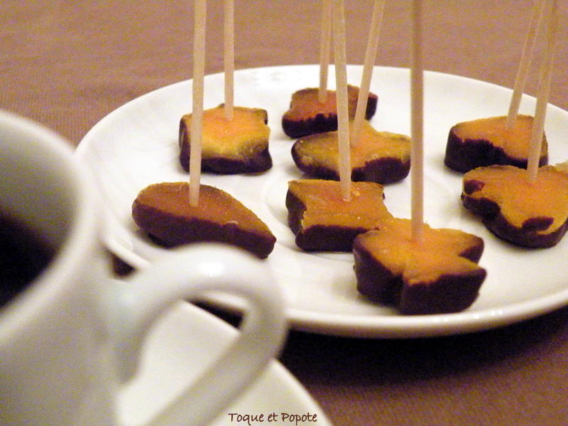 Puis, 2 solutions : Vous roulez les zestes dans du sucre cristallisé ou vous les trempez dans du chocolat fondu comme ici :