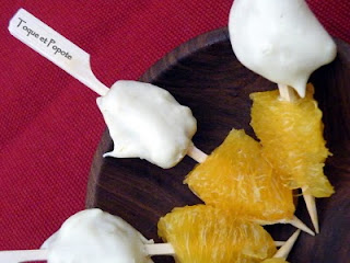 Réalisez des mini brochettes avec un morceau de suprême de quartier d’orange et bien sûr un bonbon d’ail. Placez-les au-dessus des verrines.