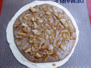 Placez un premier cercle de pâte feuilletée(250g) sur une toile Silpat ou du papier sulfurisé. Versez la crème noisette caramel au centre de cette pâte en prenant soin de laisser 1 à 2 cm sur le bord. placez les morceaux de poire au dessus. Et et surtout : insérez La Fève!!!