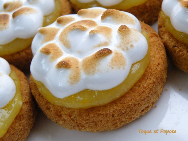 Vous pouvez maintenant assembler. A l'aide d'une poche à douille munie d'une douille unie et assez fine, dressez la crème de citron en spirale en commençant par le centre, sur les palets bretons.Avec une autre poche à douille, dressez des petits dômes de meringues, en commençant cette fois-ci par l'extérieur.