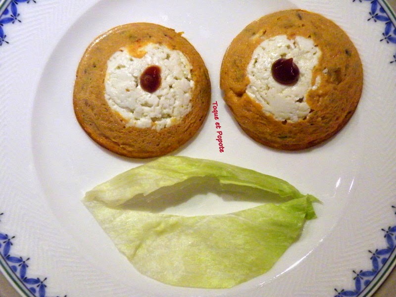Placez un peu de chèvre (une bonne cuillère à café) au fond de chaque empreinte et versez le mélange ratatouille-oeuf dans chaque empreinte.